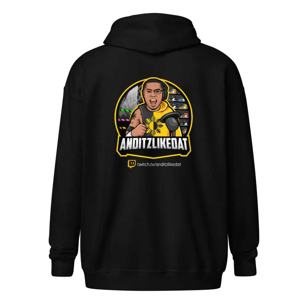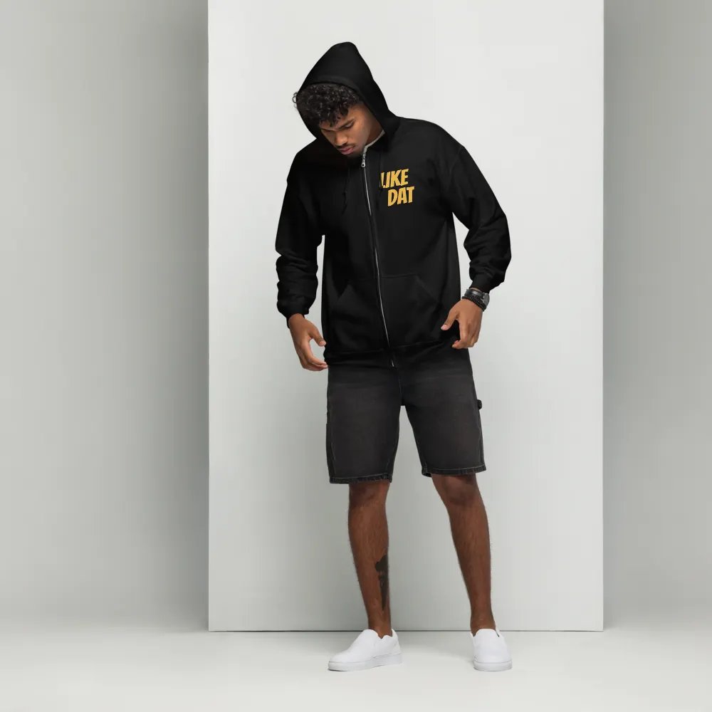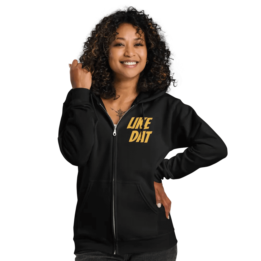 Upgrade your streetwear with our LIKE DAT Gold Zip Hoodie. Unisex heavyweight hoodie with plush fleece, premium metal zipper, overlapping fabric, and front pockets. Perfect for any season. Features the LIKE DAT emote on the front with LIKE DAT graphic on the back